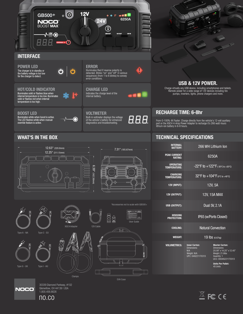 Compact, yet powerful 12V and 24V lithium jump starter rated at 20,000 Amps, 80,000 Joules3S (10,000 Amps, 40,000 Joules3S in 24V). Patented safety protection with spark-proof technology and reverse polarity protection that allows it to connect to any battery safely. Enjoy portable 12-volt power from anywhere, including tire pumps, inverters, lights, appliances and more. A high-intensity 2,200 lumen LED worklight with 7 light modes, including SOS and Emergency Strobe. Dual USB ports to recharge multiple devices on the go, like smartphones, tablets and more - over 20 smartphone recharges. Designed for both gas and diesel engines up to Class 8+/CE high-displacement vehicles, equipment, trucks and more.